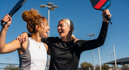 Two women, radiating joy, celebrate a pickleball win under a bright blue sky. Arms around each other, paddles raised, they embody teamwork, success, and pure enjoyment.