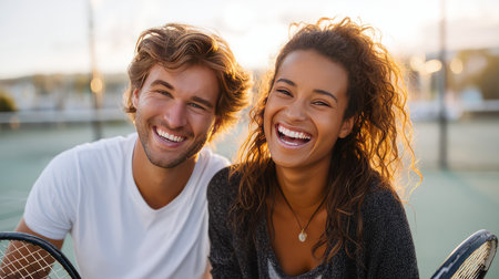 Happy young laughing black couple with tennis racket and ball on the tennis court at dawn in pink light.