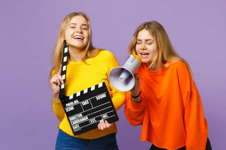 Two pretty young blonde twins sisters girls holding classic black film making clapperboard, scream on megaphone isolated on violet blue background. People family lifestyle concept. Mock up copy space