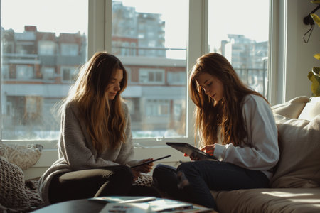 Two women sitting on a couch, looking at a tablet in a cozy home setting, portraying a casual lifestyle.