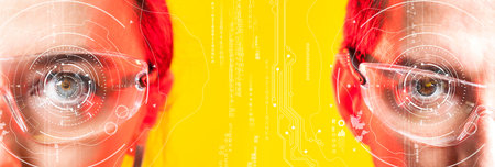 Close up eye in glasses with futuristic holographic interface to display data.future technology, internet concept.