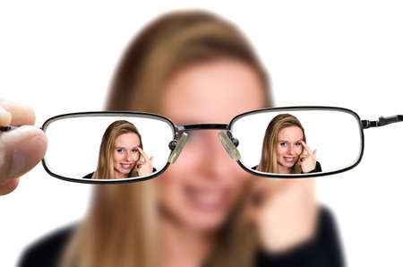 Closeup portrait of young women with glasses. She has eyesight problems and is squinting his eyes a little bit. Beautiful girl is holding eyeglasses right in front of camera with two hand.