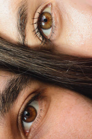 Collage of close-up male and female eyes isolated on colored backgorund with copy space for ads. Multicolored stripes. Concept of equality