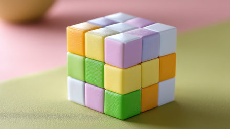 A vibrant Rubik's cube rests on a soft, pastel-colored surface, inviting curiosity and creativity with its playful arrangement and geometric forms.