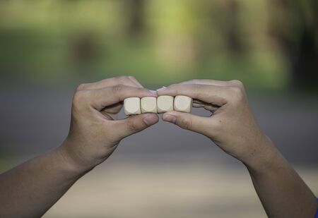 Blank wooden cube that you can put text or icon on in hand hold background.