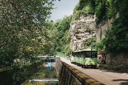 Luxembourg City,Luxembourg - May 19, 2019: Citytrain going past Petrusse river in a park in Luxembourg City. One third of the surface of the city is shaped by beautifully landscaped green spaces.