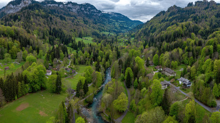 Aerial view of the small village in the Alps in Bavaria, Germany