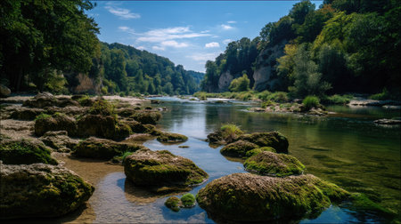 Discover the beauty of a peaceful river winding through a lush forest, surrounded by mossy rocks and vibrant greenery, perfect for nature lovers and photographers.