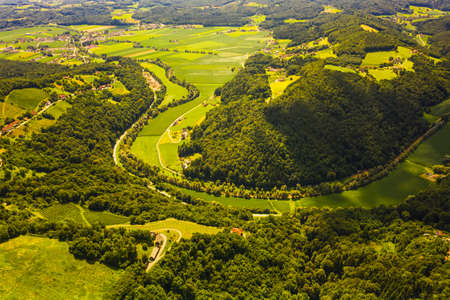 Stock showing aerial view of a winding river and road through green countryside at sunset with warm golden sunlight illuminating the landscape keywords: aerial,...