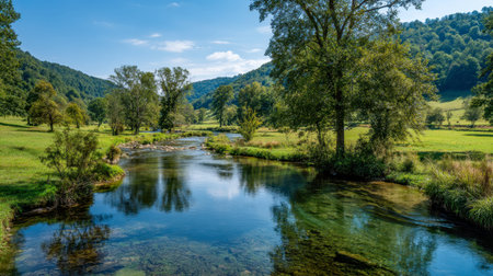 A tranquil waterway meanders through vibrant meadows and dense foliage, nestled against gentle, wooded hills beneath a clear, azure sky on a serene sunny afternoon.