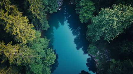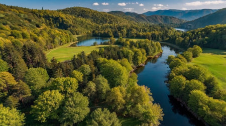 This aerial view captures a tranquil river embraced by vibrant green forests. The serene waters reflect the surrounding beauty, showcasing natures peace and harmony.