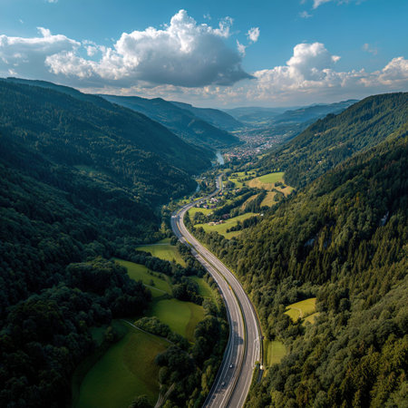 Villages showing aerial view of a river valley with a winding road and bridges connecting small villages at sunset keywords: river valley, winding road, bridges,...