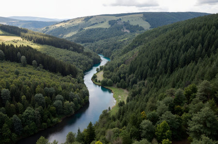 Experience the breathtaking beauty of a river winding through verdant valleys with mountains in the background, showcasing nature's tranquility and scenic allure.