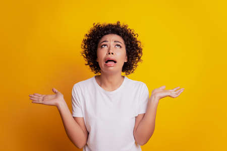 Portrait of upset stressed lady hold open palms look up empty space over yellow background