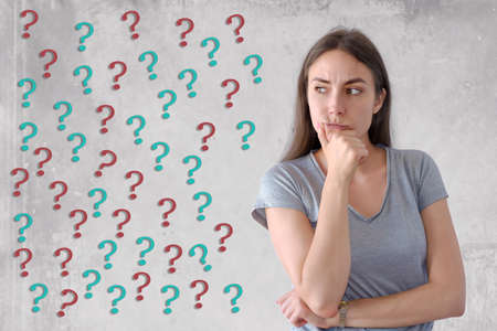 A young woman appears puzzled, contemplating her thoughts as she stands amid large question marks, creating an inquisitive atmosphere.