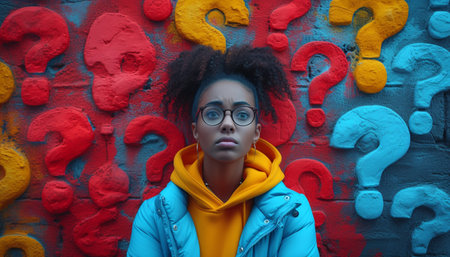 young african american woman with afro hair in yellow jacket and eyeglasses on graffiti wall with question marks