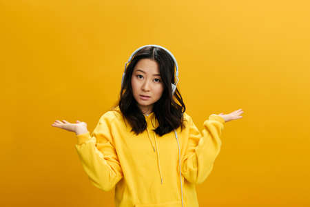 Confused serious cute Asian young woman in yellow hoodie sweatshirt raise hands up hold invisible objects posing isolated on orange studio background. Cool offer. Perfect playlist Sound App concept