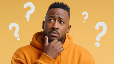 A man in a cozy orange hoodie displays a contemplative expression amid whimsical question marks, evoking feelings of curiosity and confusion against a vibrant yellow backdrop.