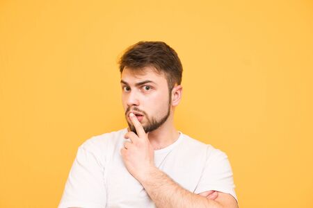 Surprised man in a white T-shirt on a yellow background holds his finger around his mouth and looks thoughtfully at the camera. Focused man is isolated on a yellow background, a portrait.