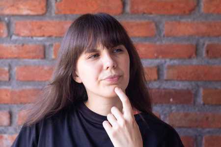 Portrait of a beautiful young pensive brunette woman with bangs wearing a black t-shirt on brick wall background