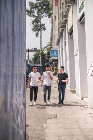 Three asian men walking on the street and eating fast food. Asia, street in Vietnam, Locals, Chinese people, real life concept, street food
