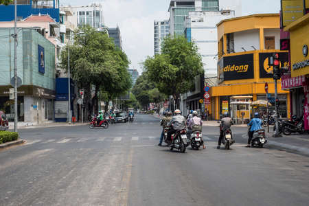 HO CHI MINH CITY, VIET NAM- APRIL 4, 2020: Deserted street, silent scene at central area of big city by request limit move around in pandemic, only few vehicle moving on day