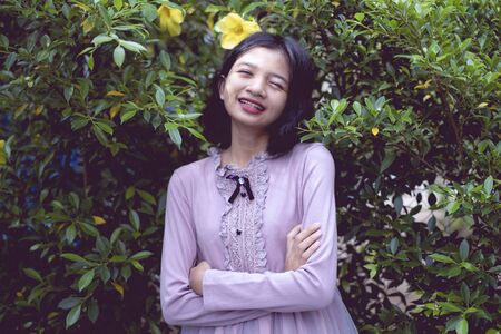 Portraits smiling Asian young girl with pine tree in vintage color.