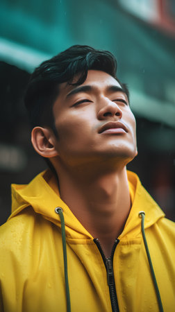 young handsome asian man in yellow raincoat looking away in city