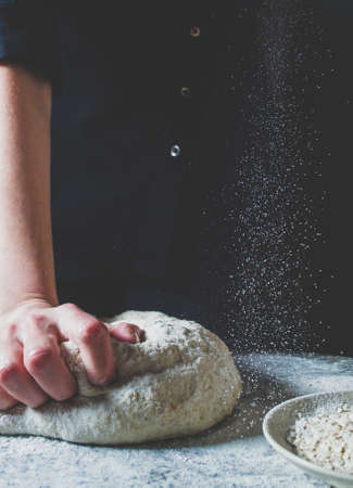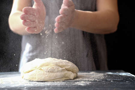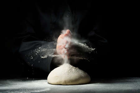 Bread making. Knead the dough in a cloud of flour dust. Food preparation concept on dark background