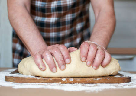A man in an apron kneads the dough on a wooden board. Hands close up