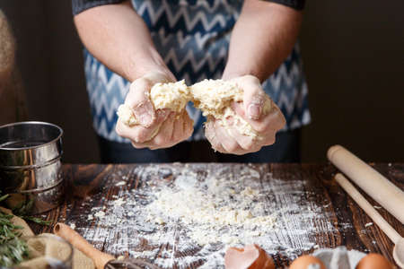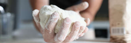 A man in a blue apron holds fresh wheat dough for baking in his hands. The process of preparing the dough. Home cooking.