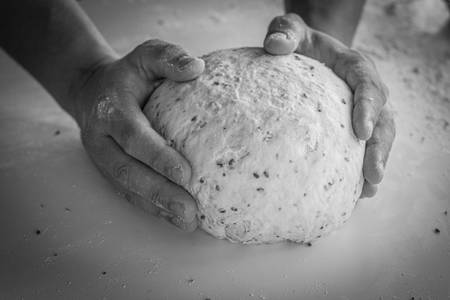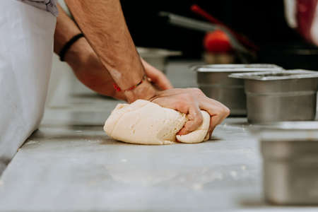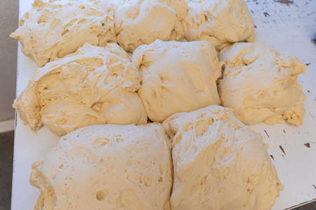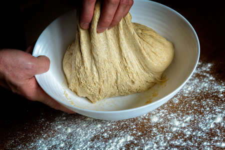 Preparing dough for white bread, rolls, pizza. Yeast dough made from wheat flour.