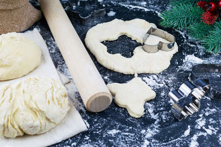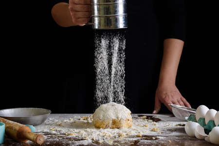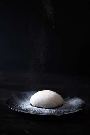 Close-up of dough and flour on a black background. Preparation for pies and rolls. Home baking, cooking.