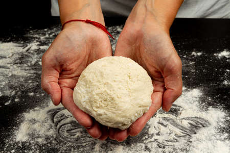 girl chef making homemade fresh yeast dough for making pizza on black wooden table background