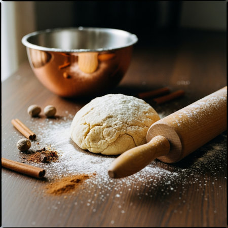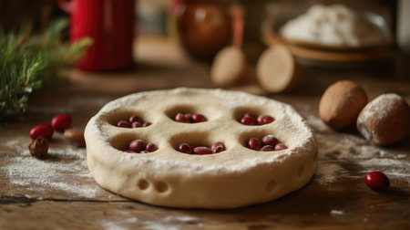 A round dough topped with red berries rests on a wooden table, surrounded by baking ingredients like flour and eggs, evoking a warm holiday baking atmosphere.
