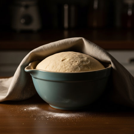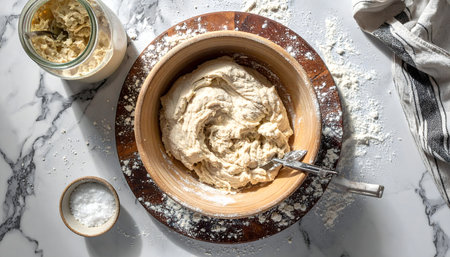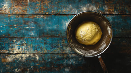A close-up view of freshly kneaded dough resting in a mixing bowl, set against a rustic wooden table. The scene evokes a warm, inviting atmosphere suitable for baking enthusiasts.