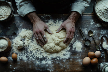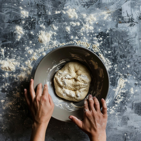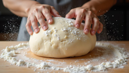 Close-up of hands kneading dough on a floured surface, capturing the essence of homemade baking. The ambiance suggests warmth and creativity in the kitchen.