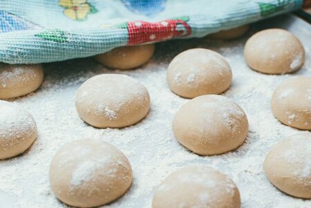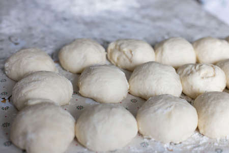 Balls from the dough for pies on the kitchen table. Baking at home. Selective focus.