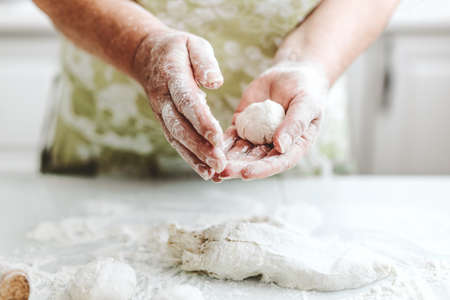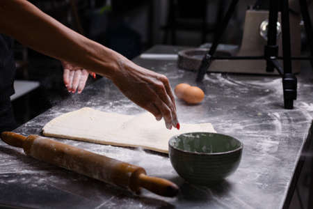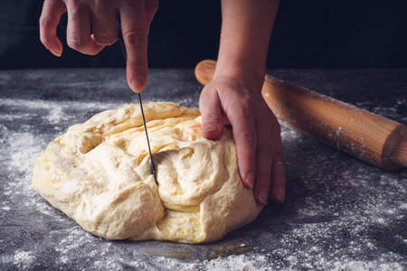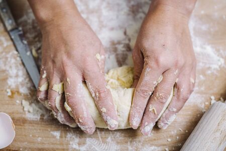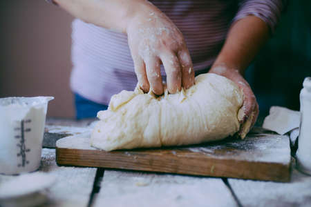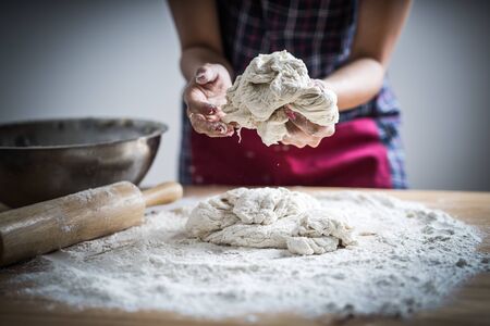 Woman at home kneading dough for cooking pasta pizza or bread. Home cooking concept. Lifestyle