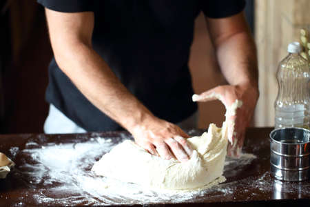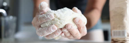 Mans hand holds the dough over table where flour is scattered. Cooking dough products at home concept