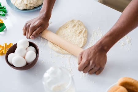 Cropped close-up view of his he guy hands making fresh handmade bread pizza pie cake rolling dough bakehouse craft on table desktop using pin in modern light white interior house kitchen