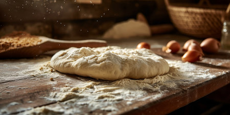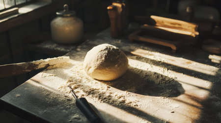 Round dough ball on a table, flour and baking tools scattered, light creating gentle shadows.
