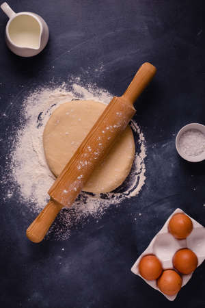 Beat flour and kitchen utensils, a baking dish, a rolling pin with eggs on the table. Baking, cooking concept. Chef making bread and gingerbread cookies. The cook kneads and rolls the dough.