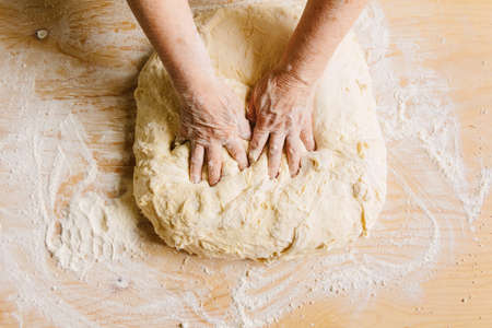 Close up view of baker kneading dough. Homemade bread. Hands preparing bread dough on wooden table. Preparing traditional homemade bread. Woman hands kneading fresh dough for making bread