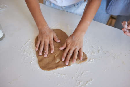 Close up image woman and little daughter knead dough with hands wooden table powdered with flour.