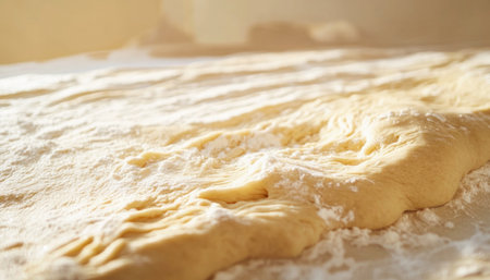 Fresh dough is kneaded and sprinkled with flour, ready for baking in a bakery kitchen
