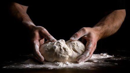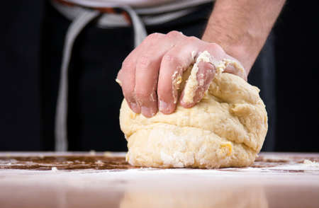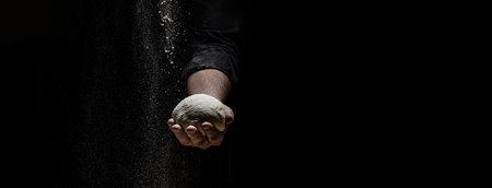 Hands of male baker preparing yeast dough with white flour dust on black background, scoop out for pasta and pizza.