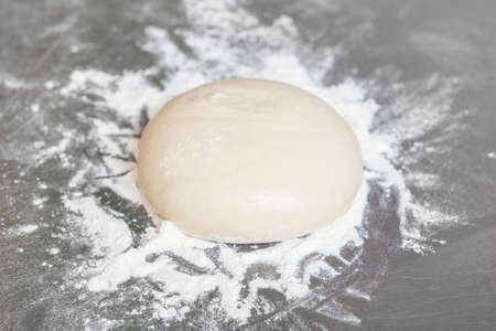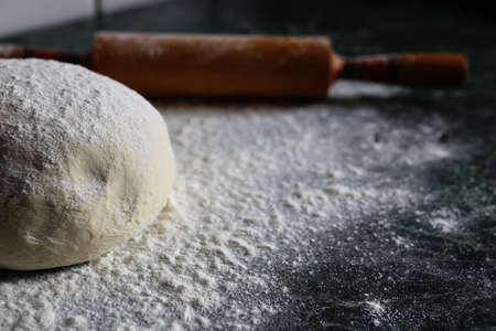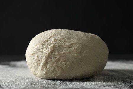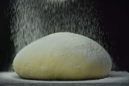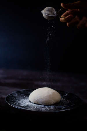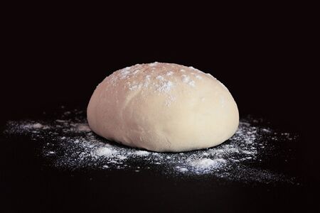 dough for bread or pizza. bakery or homemade bread in process, dough with flour powder against black background. Concept of baking and patisserie.