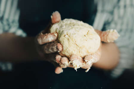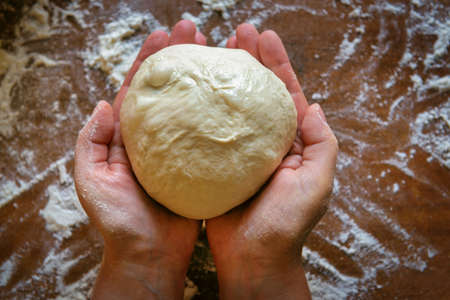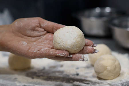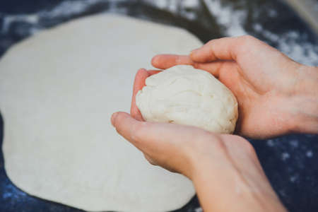 Preparing the Italian pizza. Kneading yeast dough pizza in hands