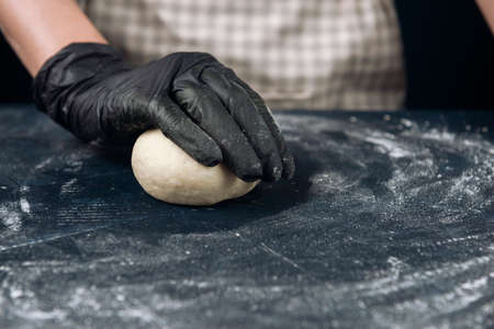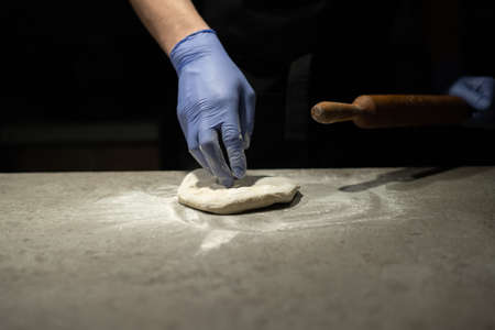 A mans hand of a baker in a rubber glove kneads pizza dough on the work table. Wooden rolling pin in hand. Baking process.